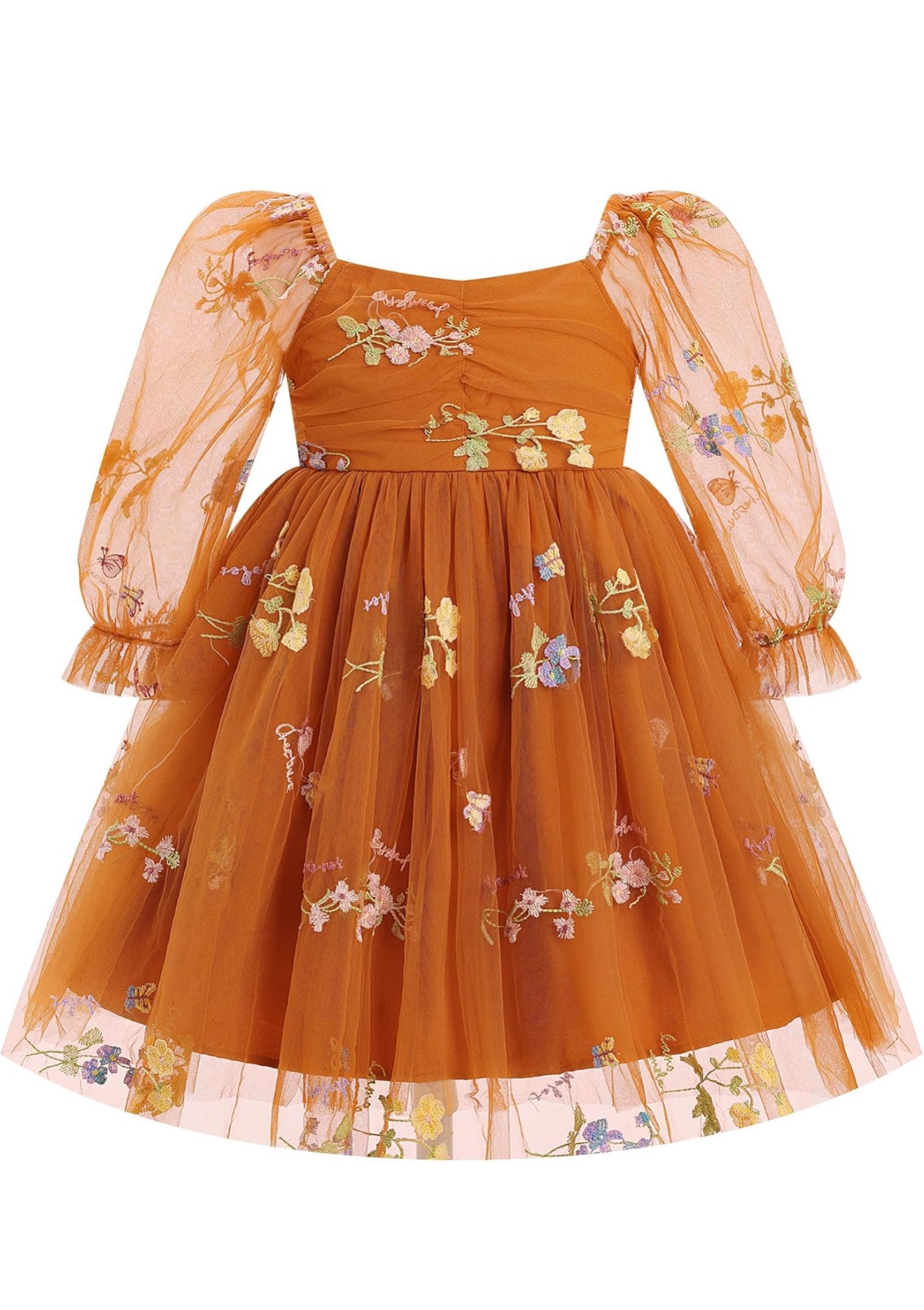 Your little one will shine in this enchanting burnt-orange tulle dress, delicately embroidered with colorful floral details. The puffed long sleeves and layered skirt create a dreamy, whimsical look—perfect for birthdays, family photos, or special occasions.