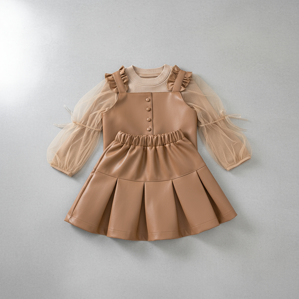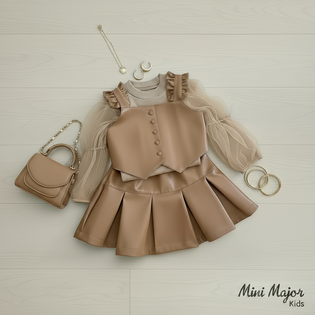Sweet, stylish, and made for little trendsetters. Our Reese Pieces set pairs a pleated caramel skirt with a button-front vest and ruffle-sleeve blouse for a timeless boutique look. Perfect for holiday gatherings, birthday parties, or any moment that deserves a little extra shine.